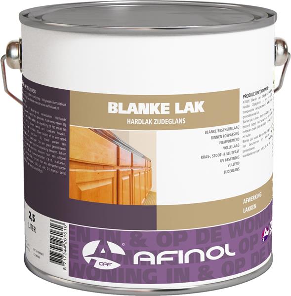 Deze blanke, slijtvaste, zijdeglanzende lak is geschikt voor het lakken van uw betonnen of houten (parket) vloer, meubelen, deuren, kozijnen etc. Afinol (OAF) Hardlak zijdeglans kan op vrijwel iedere betonnen of houten ondergrond worden aangebracht. Deze blanke lak is slijt-, stoot- en krasvasten bovendien bestand tegen chemische invloeden zoals schoonmaakmiddelen, koffie, thee, ketchup, majonaise etc. Geschikt voor binnen en buiten op schaduwrijke plaatsen.Toepassing:Houten vloeren (ook underlayment platen), tafels, stoelen, kasten, deuren, kozijnen e.d.BetonvloerenVoor binnen en buiten op schaduwrijke plaatsenEigenschappen:Slijt-, stoot- en krasvast Geschikt voor ondergronden van hout, beton of steenBestand tegen chemische invloeden Snelle droging Zijdeglans Eenvoudig aan te brengen.  Kwaliteit voor de laagste prijs!