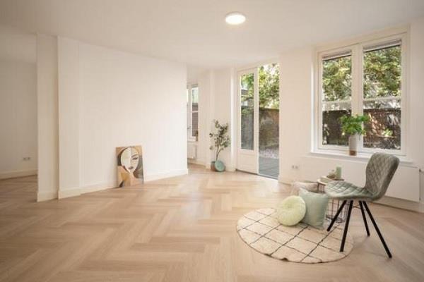 Ruime woonkamer met openslaande deuren naar de tuin. Slaapkamer aan de tuinzijde.