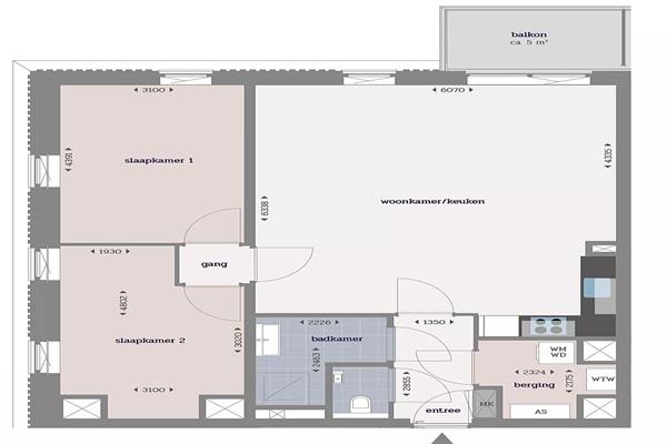 Het appartement beschikt over twee goed bemeten slaapkamers, beide met veel natuurlijk licht en flexibele indelingsmogelijkheden. De moderne badkamer is voorzien van een ruime douche en stijlvolle betegeling. Extra bergruimte bevindt zich in de hal. Daarnaast is er een aparte technische/bergruimte nabij de entree, waar het warmtepompframe, de WTW-installatie en de aansluitingen voor zowel een wasmachine als een droger zijn gesitueerd—ideaal om de woning netjes en opgeruimd te houden.