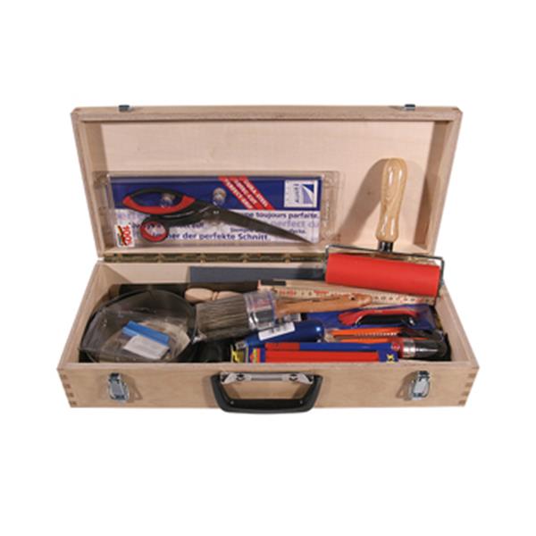 Berkenhouten behangerskist, afmeting 48 x 21 x 10 cm. Wordt compleet geleverd met als inhoud 13 stuks behanggereedschap: 1051275 behangschaar Finny 27 cm roestvrij, 1054000 schietlood staal met koord, 1059225 suwidestrijker Lion transparant, 1066260 behangsnijmes 27 cm roestvrij staal, 1068050 behangsnijband 2 m x 5 cm, 1297100 suwidesnijer, 1341500 aandrukrol 15 cm U- beugel, 1552602 duimstok Zweeds 2m, 2035045 naadrol tonvormig pvc U-beugel, 2338040-1 timmermanspotlood 18 cm, 2535000 afbreekmes prof breed model, 3377000 behangborstel zwart haar en 3440000 behangborstel wit fiber.