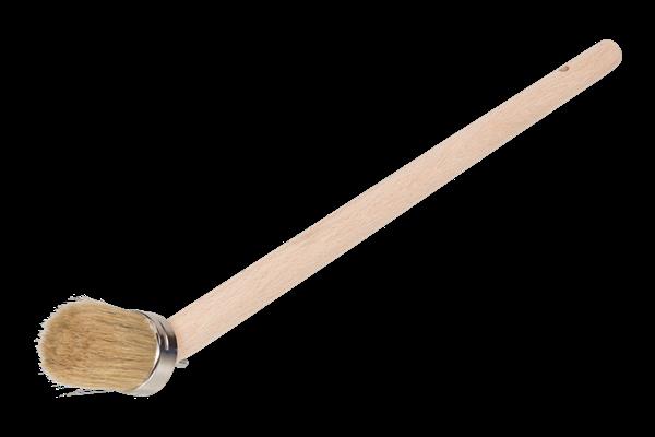 Aan de ongelakte houten steel geschroefde kop, met licht gemengd wit varkenshaar.