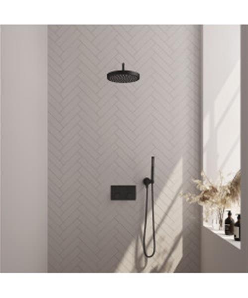 Brauer Stripe thermostatische inbouw regendouche met drukknoppen SET 26 met 25 cm douchekop en gebogen muurarm en staaf handdouche en doucheslang en wandaansluitbocht mat zwart