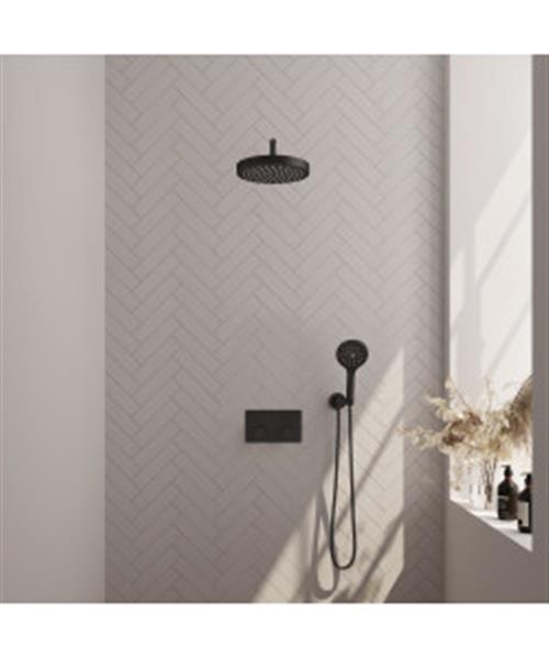 Brauer Stripe thermostatische inbouw regendouche met drukknoppen SET 29 met 25 cm douchekop en gebogen muurarm en 3-standen handdouche en doucheslang en wandaansluitbocht mat zwart