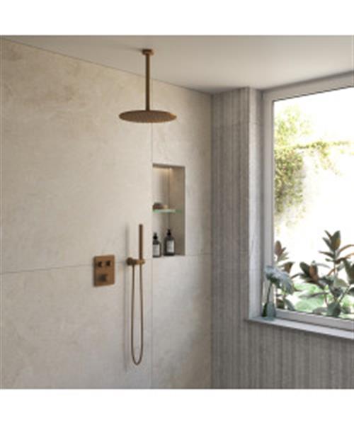 De intuïtieve drukknoppen maken het eenvoudig om te schakelen tussen de 30cm hoofddouche en de handdouche. De bronzen afwerking geeft jouw badkamer een warme en exclusieve uitstraling die jarenlang mooi blijft.