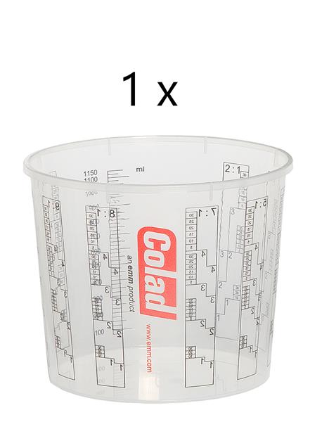 Transparant, mengverhoudingen: 2:1, 3:1, 4:1, 5:1, toevoeging van verdunning of water, afleesbaar van 5 tot 30% met milliliterverdeling. Bij de 1400ml mengbeker loopt de mililiter indicatie tot 1150ml.