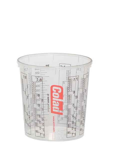 Transparant, mengverhoudingen: 2:1, 3:1, 4:1, 5:1, toevoeging van verdunning of water, afleesbaar van 5 tot 30% met milliliterverdeling. Bij de 700ml mengbeker loopt de mililiter indicatie tot 600ml.