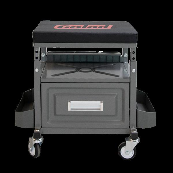 Stevig en duurzaam ontwerp. Draagvermogen 158 kg / 350 Lbs (inclusief gereedschap). In hoogte verstelbare gewatteerde zitting van 450 mm tot 530 mm. Drie zij-opbergbakjes (gewichtscapaciteit 5 kg / 11 Lbs per bakje). Afmetingen lade: L 280 mm x B 340 mm x H 170 mm. Gewichtscapaciteit voor lade: 9,1 kg / 20 Lbs. 4 hoge kwaliteit wielen, maat 3