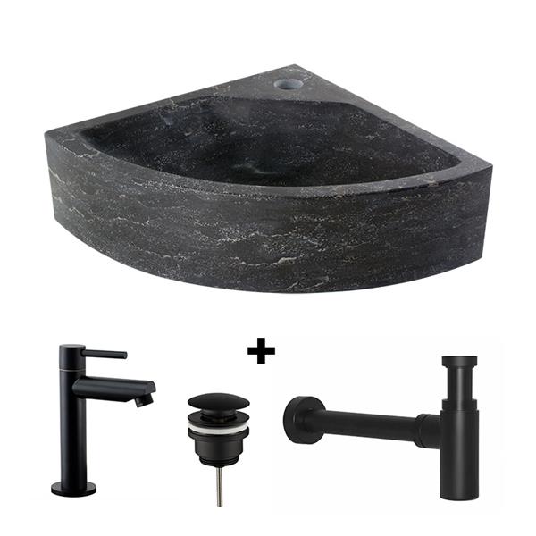 Complete set inclusief luxe mat zwarte fonteinkraan, mat zwarte afvoer sifon, mat zwarte waste en bevestigingsmateriaal.