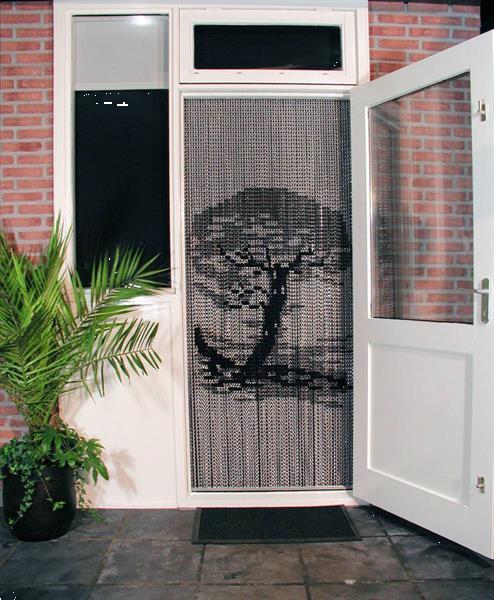 Lux vliegengordijn gemaakt van geanodiseerde aluminium kettingen met het motief van een bonsaiboom.