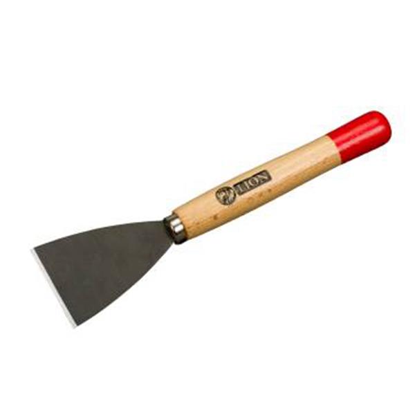 Gehard en geblauwd stalen afsteekmes. Blank gelakt houten heft met rode punt. Bladbreedte 5 cm, heftlengte 15 cm of bladbreedte 7 cm, heftlengte 19 cm.