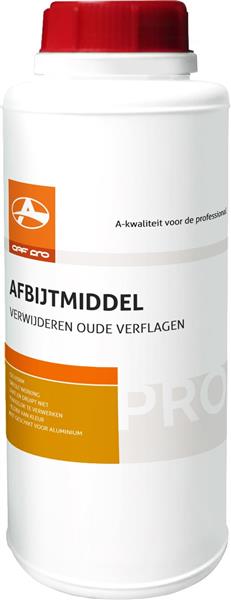 OAF Afbijtmiddel PRO is een krachtig, pasteus en helder afbijtmiddel. Ook geschikt voor het aanbrengen op verticale oppervlakken. OAF Afbijtmiddel PRO verwijdert snel en krachtig acrylaat- en alkydverven, sierpleisters, antifouling, vernissen, lijmen, graffiti op bijna alle oppervlakken.EigenschappenGemakkelijk verwerkbaarSnelle werkingZakt/ druipt nietIn ‘gel’ vormHelder van kleur ToepassingTe gebruiken op alle houtsoorten, metaal (behalve aluminium) en kunststof. Bij het afbijten van natuurlijke houtsoorten treden er geen verkleuringen op. Bepaalde kunststoffen kunnen worden aangetast. Aanbevolen wordt om bij kunststof ondergronden vooraf een test te doen op een onopvallende plaats  Kwaliteit voor de laagste prijs!
