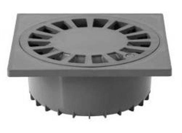 PVC Vloerput 150x150 50mm onder, Vloerput met vaste rand en rooster met verticale inwendige uitlaat, 1x spie, EN 1253-1, Bijzonderheden, PVC, Jimten, grijs (RAL7037), Zelfreinigend door hoge afvoercapaciteit. Waterslot 50 mm volgens bouwbesluit. Vergrendelbaar rooster. Goede stabiliteit bij inbetonneren door ribben aan onderzijde.