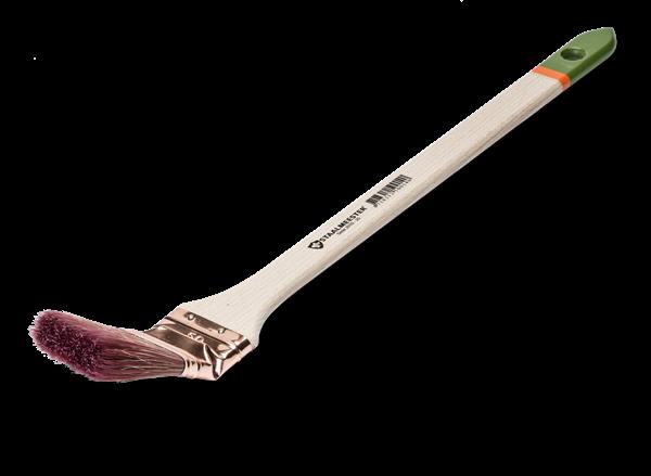 Universele radiatorkwast voorzien van de speciale Staalmeester polyestermix. Deze kwast heeft een koperkleurige band en ongelakte beukenhouten steel met de herkenbare Staalmeester gekleurde punt. Door de gebogen kop zeer geschikt voor gebruik op moeilijk bereikbare plaatsen. De karakteristiek gekleurde polyestermix is geschikt voor watergedragen en de nieuwe generatie VOC lakken en zorgt voor een streeploos eindresultaat!