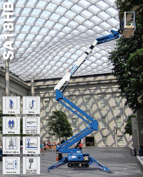 17,8 m Arbeitshöhe, 9,3 m Reichweite und nur 0,78 m Breite – perfekt für enge oder sensible Einsatzorte. Mit Hybridantrieb (Honda-Benzin & 230V Elektro), weißen Ketten, verstellbarer Laufbahnbreite, Funkfernbedienung, Einfahrautomatik, und U-Platten serienmäßig ausgestattet. Der BLUELIFT SA 18 HB in Blau-Weiß-Design hat nur ein Eigengewicht von 2,2t und ermöglicht so einen flexiblen Einsatz im Innen- und Außenbereich