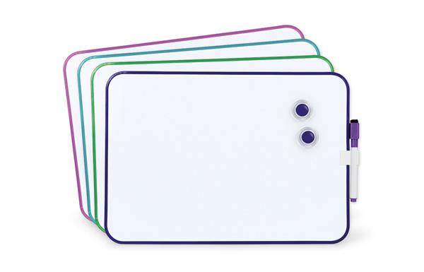 Deze set bevat 4 magnetische wisbordjes die voor schrijfoefeningen of voor groepsactiviteiten gebruikt kunnen worden. Elk wisbord heeft een gekleurde rand met afgeronde hoeken en wordt geleverd met een uitwisbare foliepen met vilten wisser en magneet in de kleur van de rand. Om de pen op te bergen bevindt zich aan de rand een pennenhouder. Op de achterzijde zijn magnetische stroken aangebracht, waarmee ze ook op metalen oppervlakken bevestigd kunnen worden. De bordjes zijn magnetisch, daardoor kunnen ze ook voor allerlei spellen en opdrachten met magneten gebruikt worden. Per whiteboard worden er 2 magneten in de de kleur van de rand meegeleverd. De wisbordjes hebben een groene, lichtblauwe, roze en paarse rand.