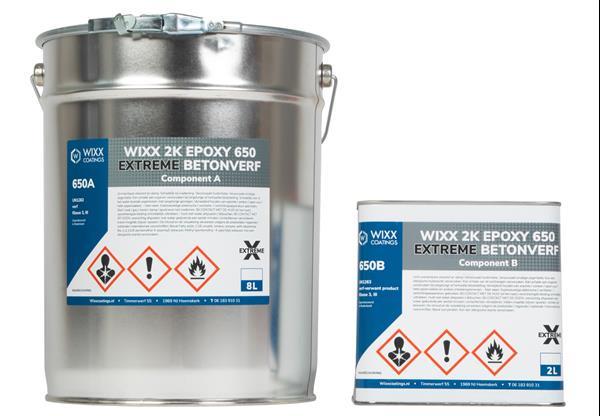 Wixx 2k Epoxy 650 betonverf is een A-kwaliteit 2 componenten betonverf die geschikt is voor mechanische en chemische werkzaamheden. Uitermate geschikt voor zware belasting: Garages Werkplaatsen Parkeergarages Showrooms Galerijen Productie ruimtes Magazijnen Verbruik is 3,25 m2 per kg. Het rendement is een indicatie en is volledig afhankelijk van het soort ondergrond. Voor een vloeistofdichte vloer die bestemd is tegen chemicaliën, Oliën, Vetten en weekmakers van banden adviseren wij een 2 laags systeem icm Wixx 2K universele primer. U heeft dus een 3 laagssyteem waardoor u een zeer duurzame vloer heeft. Wij kunnen dit in veel RAL & NCS kleuren leverenWij maken graag een passend voorstel voor u. Neem contact met ons via telefoon of email. Stappen plan Wixx 2K Epoxy 650 BetonverfDe stappen voor een gemakkelijke plaatsing van deze coating:1 Bepalen van de te behandelen vloer en afbakenen met tape en ons advies is om de randen/muren af te plakken met maskeerpapier/tape2 Voorbereiden van deze vloer door middel van opschuren en ontvetten neem hiervoor een sterk reinigingsproduct zoals bijvoorbeeld Wixx Super ontvetter. LET OP: Na reinigen niet direct beginnen met coaten. Laat het object goed doordrogen.3 Het samenvoegen van de producten kan in de emmer van de coating, hier is ruimte voor vervolgens het samengestelde product goed mengen met een mixer tot een egale massa bekomen wordt. Meng dit ca. 4 a 5 minuten4 Onmiddellijk uitschilderen van deze laag op de vloer met behulp van een 2K Nylon roller en/of verfborstel in een voldoende juiste laag.5 Deze laag dient uitgehard te zijn voordat men aan de volgende laag mag beginnen de wachttijd tussen deze 2 lagen bedraagt 24 uur.6 Vervolgens stappen 3 en 4 herhalen met het product voor de 2de laag7 Indien gewenst kan men apart antislipzand bij ons bestellen om een antislipafwerking te krijgen – dit antislipzand wordt dan in de gewenste hoeveelheid ingestrooid in de 1ste laag en overlaagd (of verzegeld) met de 2de laag.LET OP: Zodra de epoxy coating en de verharder gemengd zijn, kan men ca 1,5 uur met dit product werken! Dit is duidelijk zichtbaar omdat het product in de emmer begint in te dikken.